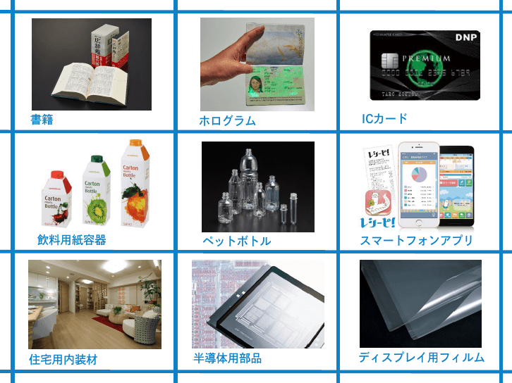 DNP大日本印刷は、本や雑誌、カタログ、パンフレット、ポスターなどの印刷はもちろんのこと、食品の箱や袋・ペットボトル、スマートフォンやTVに使われる小さな部品、銀行のカード、マンションの壁紙・床・ドアの材料など、さまざまな製品をつくっています。印刷とは関係ないようにも見えますが、じつはこれらはすべて印刷技術を応用・発展させてつくられているものです。